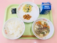 今日の給食には「大豆の磯煮」があります。カルシウムや鉄分が豊富なひじきや高野豆腐をたっぷりと使っています。成長期のみなさんに必要な栄養がとれますので、しっかり食べてほしいと思います。今日の給食も一口30回を目標によく噛んで残さず食べましょう。
