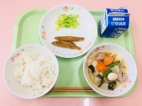 麦ごはん、牛乳、里芋のみそ汁、いわしのみぞれ煮、小松菜のごま炒め