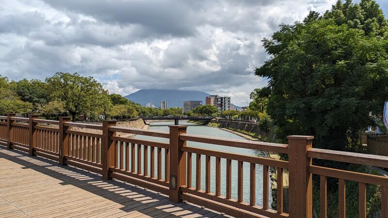 横を流れる甲突川の向こうに、桜島が見えます。やはり山頂が雲に覆われています。
