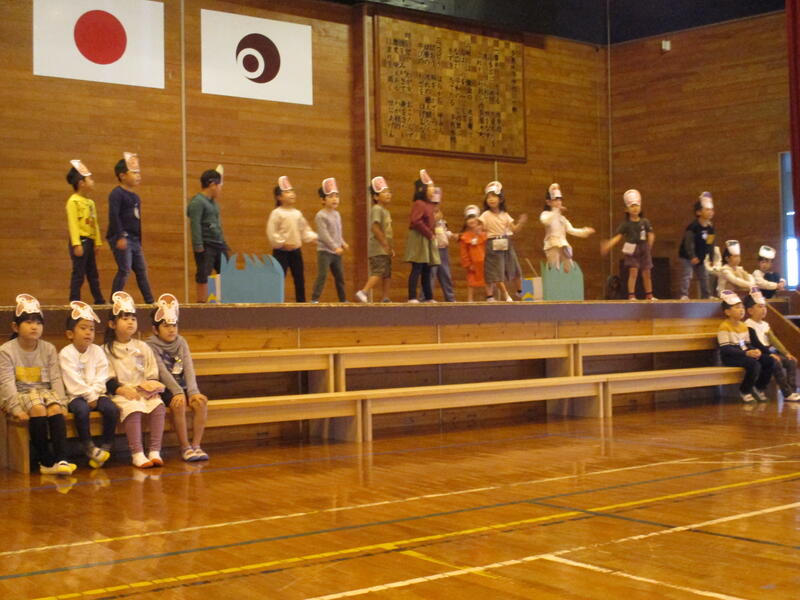 1年生は、国語科で学習した「おおきなかぶ」のお話を基に、漢字やカタカナの読み、計算問題、リズム打ち、マットを使った運動遊びなど、小学生になってできるようになったことを発表しました。