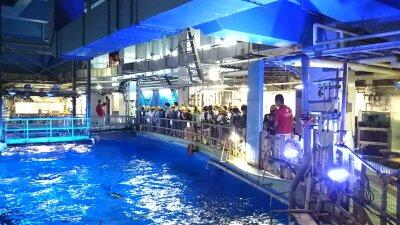 黒潮大水槽の真上のバックヤードの様子です。大水槽を上から見ています。