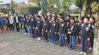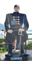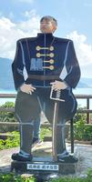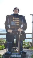 千々石観光センター到着しました。お土産が買える最後の場所となります。日露戦争で軍神と呼ばれた長崎出身の橘中佐になりきって、千々石の風を全身に浴びています。かっこいいぞ多良木っ子!