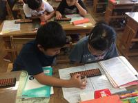 4年生の算数で、そろばんの学習をしました。3年生の時に経験していますが、多くの児童は滅多に使うことがないので、興味を持って取り組んでいました。そろばん教室に通っていたり、習ったことがあったりする児童が5名ほどおり、進んで友達に教えてくれていました。