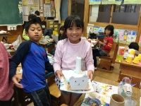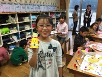今日は、2年生が図工の時間に「ころころガーレ」という作品を作っていました。子ども達は、転がるエンジン(ゴルフボール、乾電池など)を持ってきており、飾り付けた空き容器をかぶせて、かわいらしいおもちゃが出来上がっていました。出来上がった作品は坂道で転がして遊び、エンジンによる動きの違いを楽しんでいた子ども達でした。