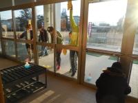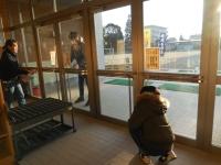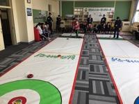 南幌小学校の見学の後は、スノーモービル体験の予定でしたが、強風のため中止となりました。代わりに、室内でパットカーリングを体験しました。