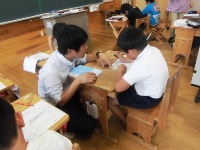 今日は、4年生と6年生が図工の時間に木材を使った製作をしていました。4年生は、金づちを使って釘を打ち付け、鳥などの動物の形をつくっていました。6年生は「ダボ」という部品や、「かぎつぎ」という仕組みを使い、組み木の製法で形をつくっていました。木を切るのには、学年に応じてのこぎりや糸のこぎりを上手に使っていた子ども達でした。