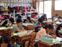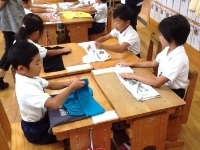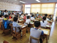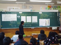 今日は、3つの学級で算数の研究授業がありました。1年生は余利先生による授業で、「小さい方」を求める学習をしました。数図ブロックと丸図を使って、答えの求め方を考えていた子ども達でした。4年生は山村先生による授業で、「真分数」と「仮分数」について学習しました。子ども達は、数直線上に分数を書き、1と比べた大小関係について仲間分けをし、きまりを見出していました。6年生は中山先生による、「割合」についての授業でした。2本の管で水槽に水を入れる問題で、子ども達は水槽に水が入る場面をイメージしながら見通しをもつことができていました。どの学年の授業でも、問題文に線をひいたり図で表したりしながら問題をしっかりと読み取り、求める数を見通して解決に取り組むことができていました。