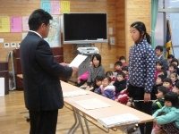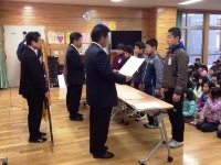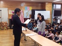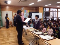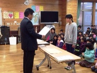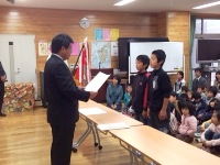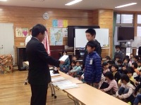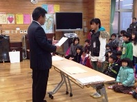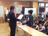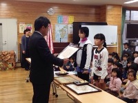 今日は、朝の活動の時間に全校集会がありました。はじめに、郡市童話発表会で多良木小学校代表として発表をした日隠さんの表彰がありました。