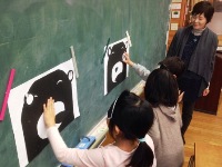 今日は、2年生がスマイルタイム(外国語活動)の時間に、体の部分の英語での言い方を教わり、「くまモンの福笑いゲーム」をしていました。ALTのデビン先生に指示された体の部分を、目隠しをして友だちと協力しながらくまモンの体に貼って行きました。ゲームの後には、とても愛くるしいくまモンが出来上がっていました。