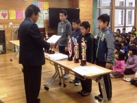 その後、各種の表彰がありました。人権担当からは、本校の「人権メッセージ」の取組が優秀であったとして奨励賞をいただいたことと、応募された1万2千点以上のメッセージの中から、5年生の今井くんのメッセージが優秀賞に選ばれたことの表彰がありました。部活動からは、バスケットボール部とサッカー部が大会で優秀な成績を残し、それぞれ表彰がありました。