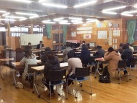 子どもたちの検診と同時に、保護者の方向けの「入学前説明会」も行われました。来年度の入学に向けての準備や、小学校の1日の流れなどについて説明がありました。