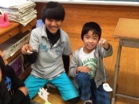 今日は、3時間目に2年生が手づくりのおもちゃで「おもちゃランド」を開き、1年生を招待しました。「魚釣り」や「空気砲」、「ブーメラン」などの様々なおもちゃが用意されていて、とても楽しそうに遊ぶ1年生でした。2年生は、1年生に遊び方を優しく教えてあげたり、おもちゃの設営をしたりして、しっかりとお世話をすることができていました。