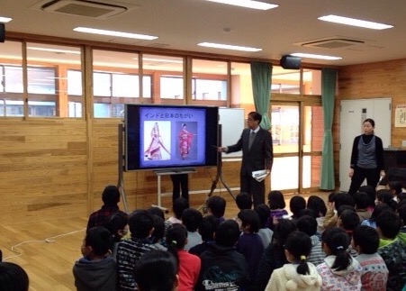 今日は、朝の時間を利用して、「ワールド集会」がありました。今回は、多良木町在住でインドがご出身のチェンマイ・デー先生に来校していただきました。インドの文化や宗教、民族、言葉、世界遺産などいろいろなものを写真を交えて教えていただきました。子どもたちは興味津々でデー先生の話に聞き入っていました。