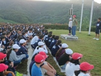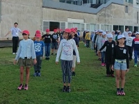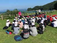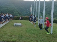集団宿泊教室も、いよいよ最終日です。ほかの学校の人たちと一緒に、朝の集いに参加しました。ラジオ体操をしたり、学校紹介をしたりしました。今日も一日、頑張ります。