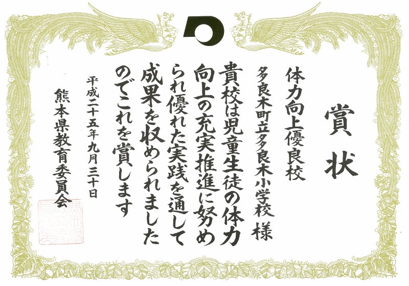 今日は、うれしい話題をもう一つ。このたび、多良木っ子の頑張りが認められ、「体力向上優良校」と「人権メッセージ奨励賞」という形で賞状をいただきました。これからもいろいろな形で頑張って欲しいと思います。