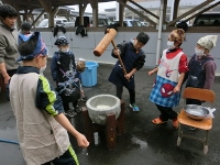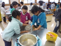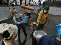 子どもたちは、餅つき班(男子)と豚汁班(女子)に分かれ、保護者の方々にアドバイスをもらいながら活動しました。慣れない作業に苦労しながらも、おいしい餅のために一生懸命餅をつきました。餅をつき終えた後、みんなで食べた餅の味は格別だったようです。