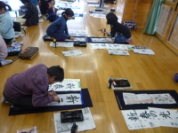 今日の書写で書初めの練習をしました。書いた文字は、「新春の光」です。まずは新聞紙を条幅紙のサイズに切って練習しました。普段使っている半紙とは大きさも形も異なるため、子どもたちは、文字のバランスをとるのに苦労していました。しかし、瀧森先生にアドバイスをいただきながら練習を続けると、どんどん上手になり、形の整った文字を書けるようになりました。