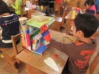 1年生は、図工で「ゆめのまちさんちょうめ」という題材で工作に取り組みました。いろいろな大きさや形の箱、材料を集め、自分が住んでみたい町や行ってみたい町などのイメージを膨らませながら、楽しく活動することができました。今日は、出来上がった作品をお互いに鑑賞もしました。「家の壁の色がすてきでした。」「細かいところまで工夫していていいと思いました。」とたくさんいいところが出てきました。自分の作品のすてきなところを見つけてもらい、思わず笑顔が溢れていました。