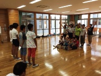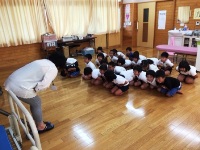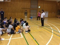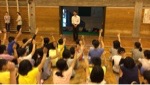 集団宿泊教室2日目は雨天のため、体育館での朝の集いから始まりました。