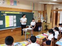 今日は、1年生教室で外国語活動の「スマイルタイム」が行われていました。はじめに、ALTのデヴィン先生の自己紹介がありました。アメリカから多良木まで23時間かかることや、デヴィン先生の家族などについて、興味をもって話を聞いていた子ども達でした。その後、英語での自己紹介の仕方を教わり、子ども達自身も、自分の名前を英語で紹介することができていました。