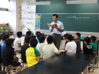今日は、朝の活動の時間に、ワールド集会がありました。今年度、新たに多良木町に来られたALTのTimothy Hoth(ティモシー・ホス)先生においでいただき、先生の自己紹介と、出身地であるアメリカについて話をしていただきました。ティモシー先生はニューヨーク州の出身で、ニューヨーク州には、テレビなどでよく見る都会ばかりでなく、農場などの自然も多いことを教えてくださいました。はじめて知ることも多く、興味津々で話を聞いていた子ども達でした。
