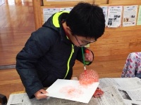 今日は、2年生が図工の時間に「キラキラシャボンで」という題材の活動をしていました。子ども達は色をつけた石鹸水をストローで吹いて泡立て、綺麗な泡の形を紙に写し取って様々な模様を描いていました。その後は、クレパスで描いた線を指やティッシュペーパーでこすってぼかし、綺麗なグラデーションをつくる活動もしていました。子ども達は泡立てた形やぼかした色などの効果を楽しみ、豊かな発想をしながら活動することができていました。