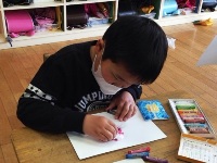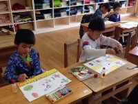 今日は、2年生が図工の時間に「好きなことなあに」という題材の学習をしていました。子ども達は、6枚の小さな画用紙に野球や動物などの自分が好きなものの絵を描き、色画用紙に張りつけていました。色画用紙にも飾り付けをし、とてもかわいらしい作品ができていました。