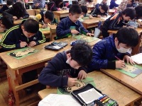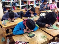今日は、4年生が木版画に取り組んでいました。子ども達は版に自分の顔を描き、彫刻刀で丁寧に彫っていました。図工室で印刷をしていた子ども達は、刷り上がった作品を見て「すごい。コピー機みたい!」と感心していました。出来上がった作品は、「2分の1成人式」の時に、保護者の方にプレゼントするのだそうです。良い作品ができるように、頑張っている4年生です。