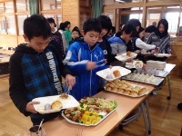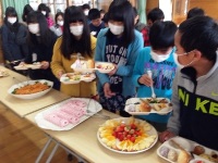 今日は、6年生の給食が卒業を記念した「バイキング給食」でした。子ども達は、彩りの良い豊富なメニューをバイキング形式で順番に自分の皿につぎ分けていました。大皿には、フライドポテトやハンバーグ、スパゲッティなど、子ども達の大好きなメニューが用意されていました。デザートには果物やケーキもあり、子ども達は嬉しそうに給食を食べていました。小学校での思い出に残る給食の時間となったようです。