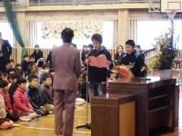 今日は、平成26年度卒業証書授与式が行われました。多数の来賓や保護者の方々に見守られ、厳かな雰囲気の中で卒業生一人一人に卒業証書が手渡されました。校長先生からは、「目標なき者に努力なし、努力なき者に成功なし」という言葉が贈られました。「卒業の詩」を、大きな声でセリフを言い、気持ちを込めて歌を歌う子ども達の姿が印象的でした。立派な姿で多良木小学校を卒業した子ども達。中学校でのより一層の頑張りと、活躍を期待しています。