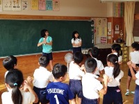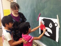 今日は、2年生がスマイルタイム(外国語活動)の時間に、体の部分の英語での言い方を教わり、「くまモンの福笑いゲーム」をしていました。ALTのデビン先生に指示された体の部分を、目隠しをして友だちと協力しながらくまモンの体に貼って行きました。ゲームの後には、とても愛くるしいくまモンが出来上がっていました。