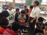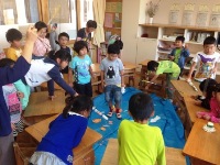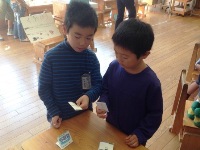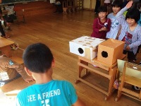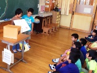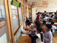 今日は、3時間目に2年生が手づくりのおもちゃで「おもちゃランド」を開き、1年生を招待しました。「魚釣り」や「空気砲」、「ブーメラン」などの様々なおもちゃが用意されていて、とても楽しそうに遊ぶ1年生でした。2年生は、1年生に遊び方を優しく教えてあげたり、おもちゃの設営をしたりして、しっかりとお世話をすることができていました。