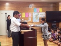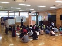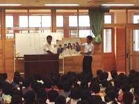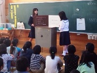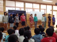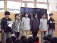 今日は、朝の活動の時間に全校集会がありました。はじめに、郡市童話発表会で多良木小学校代表として発表をした日隠さんの表彰がありました。