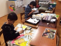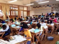 今日は、なかよし学級の様子をお知らせします。なかよし学級では、5年生の児童は梨狩りの絵を、6年生の児童は組体操の絵を描いていました。先生の指導のもと、子どもたちは細かな部分までしっかりと色付けをしていました。美術展に向けて、よい作品ができそうです。