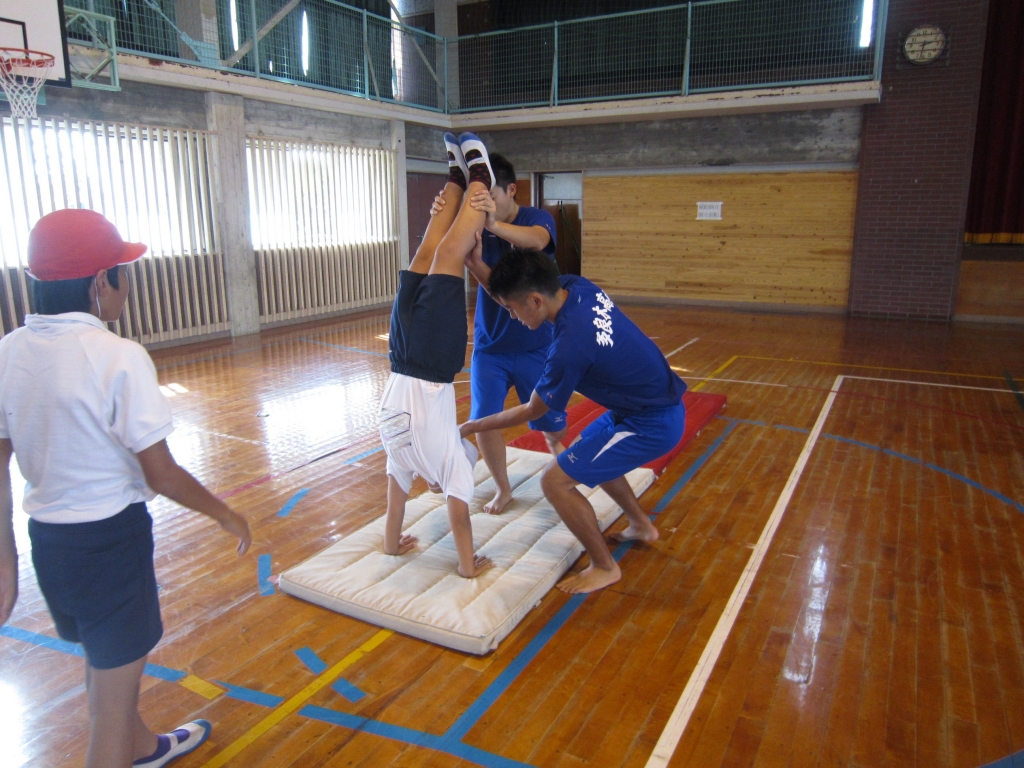 今日は、5,6時間目、5年生が多良木高校の3年生を招いて体育の授業(マット運動)を行いました。体力向上モデル校事業の一環で昨年度に引き続き、2年目になります。5年生は6つのコース(倒立前転や飛び込み前転など)に分かれて教えてもらいました。これまでできなかった技ができるようになり、嬉しそうにしている児童がたくさんいました。