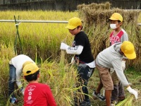 今日は、5年生が育てている米の稲刈りが町内3校合同でありました。JAの方々にご協力いただき、稲刈りの仕方を教えてもらいながら、たわわに実った稲を丁寧に刈り取っていった子どもたちでした。刈り取った稲は藁で縛り、竿に干していきました。時間いっぱい懸命に取り組んだ子どもたちは米作りの大変さを体験することができ、それらに携わる人たちへの感謝の気持ちをもつことができていました。