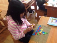 今日は、1年生が算数の時間に図形の学習をしていました。「かたちづくり」という単元で、三角形の色板を敷き詰めてヨットや魚などの形をつくっていました。授業の後半では自由に色板を敷き詰め、自分たちで新たな形を見つけていました。子ども達は色板を回したりずらしたりしながら意欲的に活動し、同じ形を敷き詰めて別の形をつくる楽しさを味わっていました。