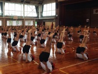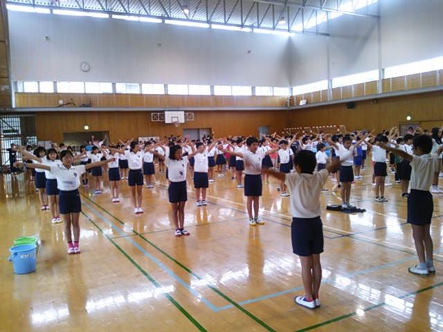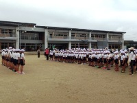 朝の集いがありましたが、朝から小雨が降っていて体育館での実施となりました。
