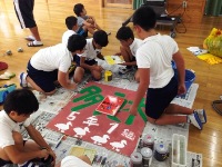 また、5年生が総合的な学習の時間に、米を育てている田に立てる看板と、かかしを製作していました。かかし造りでは家庭科での裁縫の学習を生かし、胴体や顔の部分を丁寧に造っていました。5年生みんなの個性あふれる作品になりそうです。