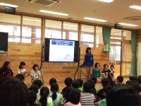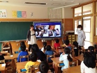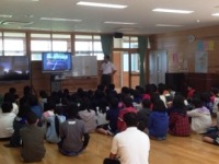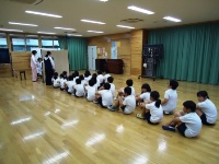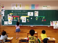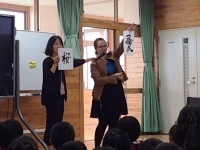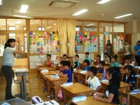 今日は、朝の活動の時間にワールド集会がありました。ALTのデビン先生が、日本の素晴らしいと思うことを、ランキング形式で紹介されました。今、アメリカで一番人気のあるアニメはポケモンだと紹介されると、子どもたちは「へぇ~!そうなんだ!!」ととても驚いていました。その他にも、デビン先生の一番好きな食べ物(うどん)の話や、今熱中していること(書写)の話も、興味をもって聞いていた子どもたちでした。