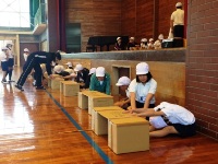 校長先生からの講評では、避難の際に重要な「おかしも(押さない・駆けない・しゃべらない・戻らない)」の4つのポイントについて確認がありました。また、担当の金山先生からは、安全確保のポイントとなる「おちたいど(落ちてこない・倒れてこない・移動してこない)」についての話がありました。いつ、どこで地震が起きたとしても、自分の命は自分で守ることができるように、今日の訓練をしっかりと覚えていてほしいです。
