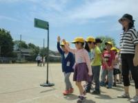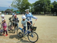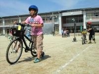 運動場につくられたコースを実際に通行しながら、1・2年生は安全な歩き方について、3・4年生は自転車の正しい乗り方について確認しました。交差点では「止まる・見る・確かめる」をしっかりと行い、安全な横断の仕方ができていた子どもたちでした。5・6年生は自転車での事故についてのビデオを見ながら、自転車での事故防止について考えました。