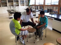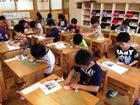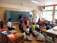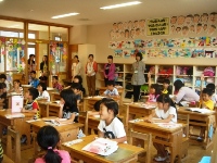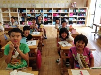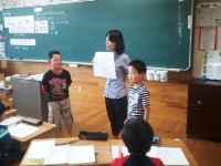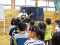 今日は、1・2年生が「スマイルタイム」の時間で、外国語(英語)の学習をしていました。スマイルタイムでは、社会人講師の沖先生とALTのデビン先生と一緒に、1年生から英語に親しんでいます。