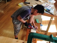 今日は、4年生が図工の学習で、のこぎりを使って製作をしていました。はじめに、刃を入れる角度や引く速さなど、切る段階によってのこぎりの扱い方が違うことを教わっていました。その後、教わったことを意識しながら、慎重に木の板の切断に挑戦していました。集中して製作に取り組み、道具の扱い方になれることができていたと思います。