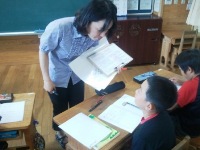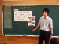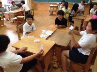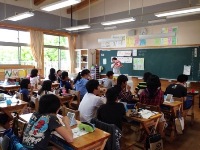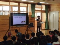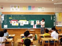今日は1年生にとって初めてのスマイルタイムでした。デビン先生の出身地や家族構成、好きな食べ物などを、英語で自己紹介してもらいました。アメリカで撮られた写真を見ながら、興味をもって話を聞いていた子どもたちでした。2年生は、自分の名前を英語で紹介し、手作りの名刺を交換する活動をしていました。これからも楽しく活動をし、英語の表現に親んでほしいです。