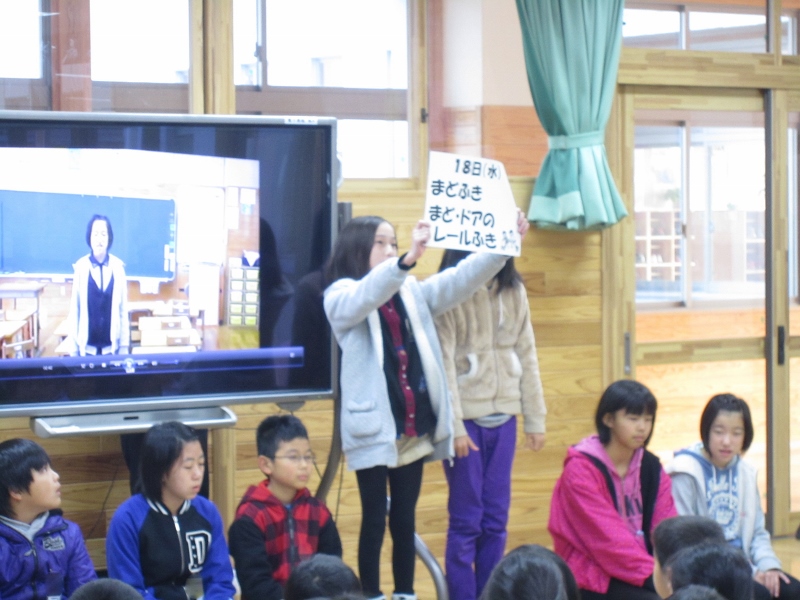 今日は、朝の時間を利用して、児童集会がありました。美化委員会が大掃除期間に伴い、掃除の仕方についてビデオやフリップを使って詳しく教えてくれました。掃除の上手な学級や教室にはピカるん(多良木小オリジナルキャラクター)のカードが貼られます。ピカるんがたくさんあちらこちらに見られる多良木小になると思います。