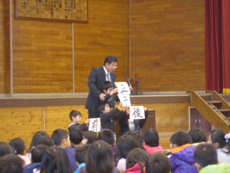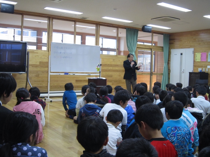 今日は、朝の時間を利用して「キャリア集会」がありました。今日は、日頃よりお世話になっている長田勝幸さんに講話をお願いしました。長田さんには、毎朝、町民体育館前の交差点で交通指導をしていただいており、そのお礼を伝えるよい機会ともなりました。