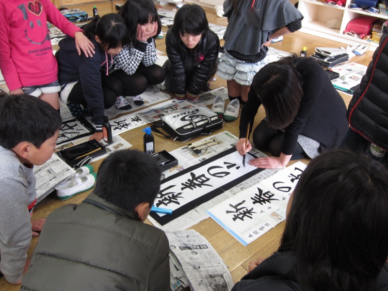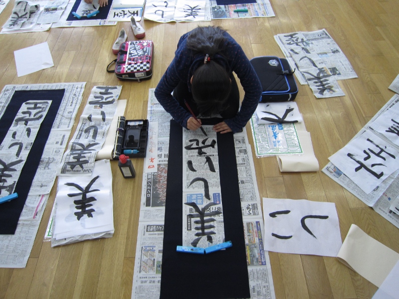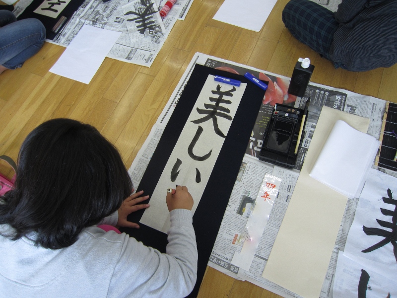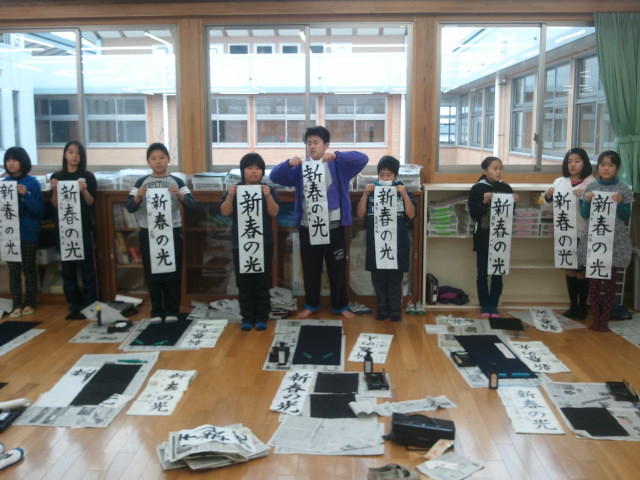 今日は、5年生が書き初めのための条幅にチャレンジしました。「新春の光」と書きました。普段は半紙にしか書かないので、慣れない様子でしたが、さすが高学年。要領をつかんで上手に書くことができました。清書は年明けに行います。