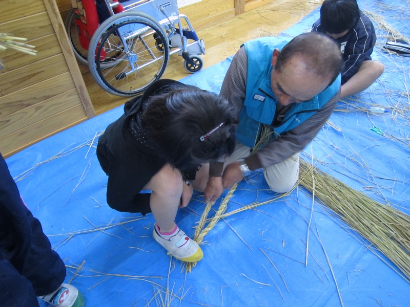 今日は、5年生が「しめ縄」づくりを行いました。ゲストティーチャーとして湯前町の椎葉さんに来ていただき、作り方を指導していただきました。また、右田さん、内山さんもお手伝いに来られました。初めて経験する子どもたちが多く、わらを足で押さえ、手でよじりながらする作業に悪戦苦闘でした。5年生は4月からお米作りを行ってきました。稲刈りの後に行われる日本の伝統行事を体験する貴重な機会となりました。