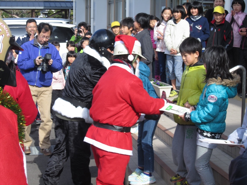 今日は、昼休みにバイク(ハーレーダビッドソン)に乗ったたくさんのサンタさんから多良木小全児童にプレゼントが届きました。各学年の児童代表がプレゼント(ノート)を受け取りました。バイクに乗った見慣れないサンタさんに多良木小の全児童は大興奮。楽しい一幕でした。バイクに乗ったサンタさん達、プレゼントありがとうございました。
